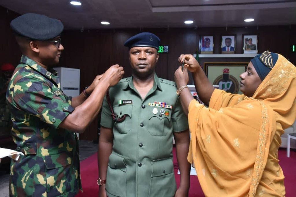 The Director General of the National Youth Service Corps (NYSC), Olakunle Nafiu, has decorated his Military Assistant, Shuaibu Muhammad, with his new rank of Lieutenant Colonel.